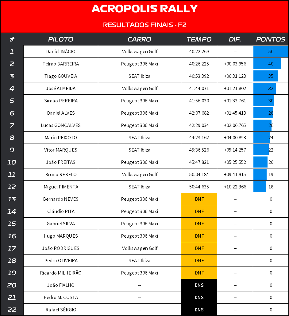 Nos F2 tive um furo logo nos primeiros metros, de resto até andei bem e sem grandes erros. Bati nas tais pedras e capotei, mas a Ibiza seguiu fixe. No final, nem o furo me faria subir lugares, pois o minuto perdido aí não era recuperável em andamento. Serve para manter vivo o pódio das equipas, já que o Tiago andou muito bem.